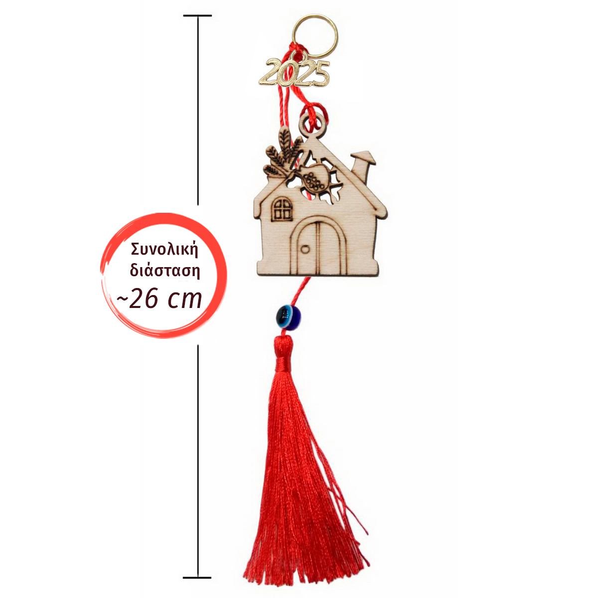 Γούρι Διακόσμησης ξύλινο, 26cm σπίτι με ρόδι με κόκκινη φούντα και χάντρα